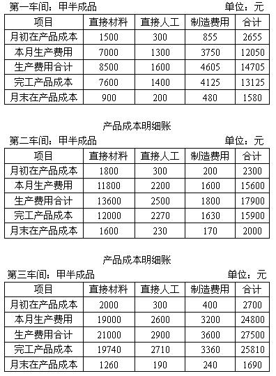 2. 某工业企业甲产品分三个步骤生产,分别由第一、第二、第三3个车间进行,采用逐步结转分步法计算成本。甲半成品成本的结转采用综合结转法(按实际成本),各步骤对半成品的收发通过半成品库进行,假设第一、第二车间月初半产品库期初库存均为零。2006年5月份甲产品各步骤产品成本明细账如下: