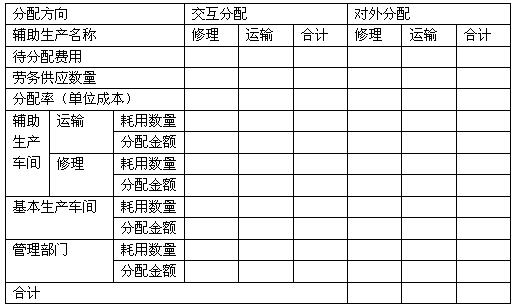 要求:采用交互分配法分配生产费用,编制辅助生产费用分配表(直接填列以下表格即可),并编制有关会计分录(“辅助生产成本”列示二级科目)