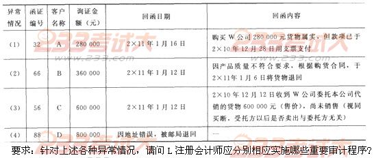 2.ABC会计师事务所接受委托,审计W公司2×10年度的财务报表。L注册会计师了解和测试了与应收账款相关的内部控制,并将重大错报风险评估为高水平。L注册会计师取得2×10年12月31日的应收账款明细表,并于2×11年1月10日采用积极式函证方式对所有重要客户寄发了询证函。