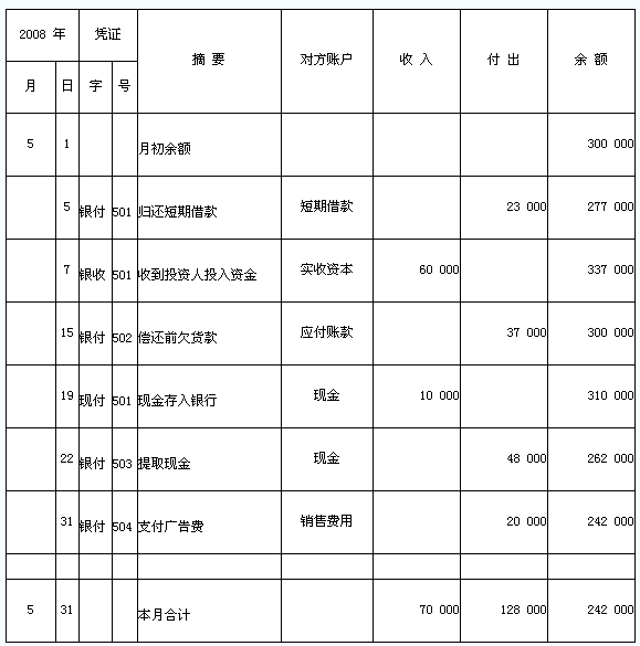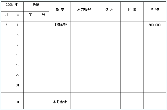 | 22.广州利浦有限责任公司2008年4月30日的银行存款日记账余额为300 000元,该公司2008年5月发生的银行存款和现金收付业务及其记账凭证编号如下:(本题11分) (1)5月5日,以银行存款归还短期借款23 000元。(银付501号) (2)5月7日,收到投资者投入资金60 000元存入银行。(银收501号) (3)5月15日,以银行存款偿还前欠货款37 000元。(银付502号) (4)5月19日,将现金10 000元存入银行。(现付501号) (5)5月22日,从银行提取现金48 000元,准备发放工资。(银付503号) (6)5月31日,以银行存款支付广告费20 000元。(银付504号) 要求: (1)根据上述经济业务,登记给出的银行存款日记账(每日需结出余额),并结出5月末的银行存款日记账余额。 表1 银行存款日记帐 ![]() (2)2008年6月5日,利浦公司收到银行寄送的银行对账单,银行对账单数据表明,利浦公司2008年5月31日银行存款余额为304 000元。经逐步核对,发现有以下几笔未达账项,请根据(1)得出的公司银行存款日记账余额及所给出的相关资料填制银行存款余额调节表。 ①5月15日,以银行存款偿还前欠货款37 000元,公司已登记入账,银行尚未登记入账。 ②5月19日,将现金10 000元存入银行,公司已登记入账,银行尚未登记入账。 ③5月25日,收到销售款50 000元,银行已登记入账,但公司尚未收到收款通知单,未登记入账。 ④5月31日,银行代扣公司应付水电费15 000元,银行已登记入账,公司尚未收到付款通知单,未登记入账。 表2 银行存款余额调节表 2008年5月31日 ![]() |