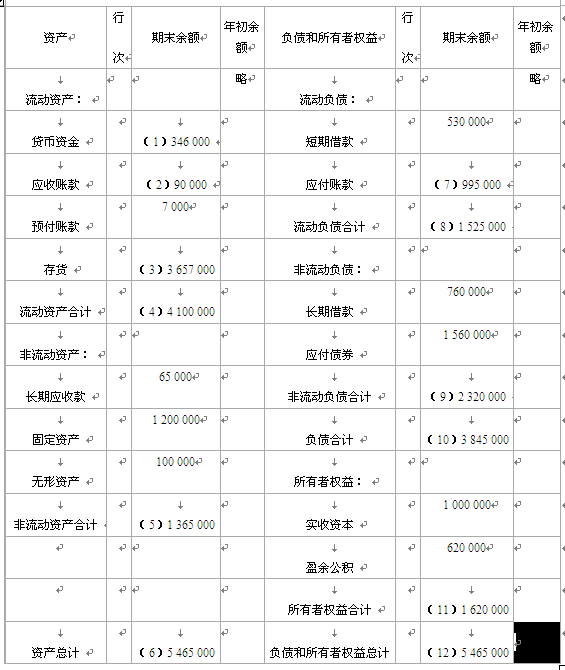 | 正确答案: (1) 编制的会计分录如下: ①借:应付账款 30 000 贷:银行存款 30 000 ②借:固定资产 210 000 贷:应付账款 210 000 ③借:库存商品 200 000 贷:生产成本 200 000 ④借:银行存款 300 000 贷:应收账款 300 000 (2) 填列后的资产负债表如下: ![]() |