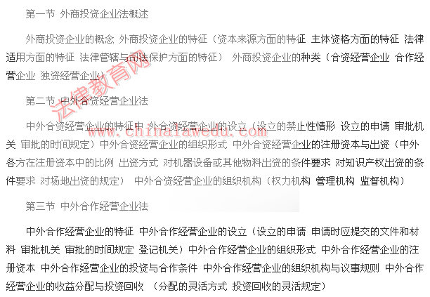 外资企业的特征 外资企业的设立(设立的禁止性规定 设立程序) 外资企业的组织形式与注册资本(有限责任公司的形式 其他责任形式 注册资本的规定) 外国投资者的出资方式与缴资期限(对机器设备、工业产权和专有技术出资的要求 对出资期限的要求)
