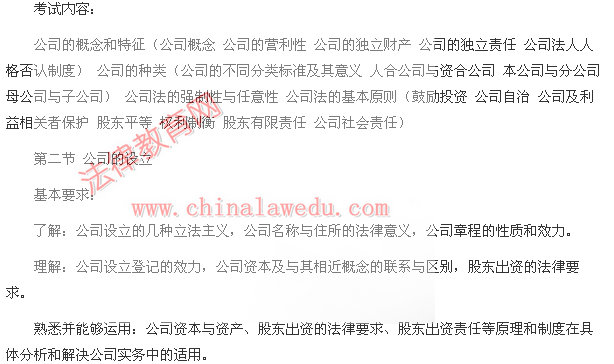 公司设立的概念(公司设立与公司成立的区别) 公司设立的方式(发起设立 募集设立) 公司设立的登记(公司登记与营业登记 登记机关 登记的程序 登记的效力) 发起人(发起人的概念 发起人的职责 发起人责任与公司责任的区分) 公司章程(公司章程的概念和性质 公司章程的特点 公司章程的订立与修改 公司章程的效力) 公司的资本(公司资本、资产及净资产的概念及相互关系 公司资本原则 资本的一次缴纳制与分期缴纳制) 股东的出资(股东出资的法律意义 股东出资义务 股东出资责任 股东出资的形式 股东出资的法定要求)