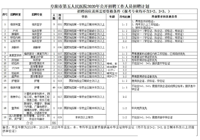 附件1:《阜阳市第五人民医院2020年公开招聘工作人员计划表》