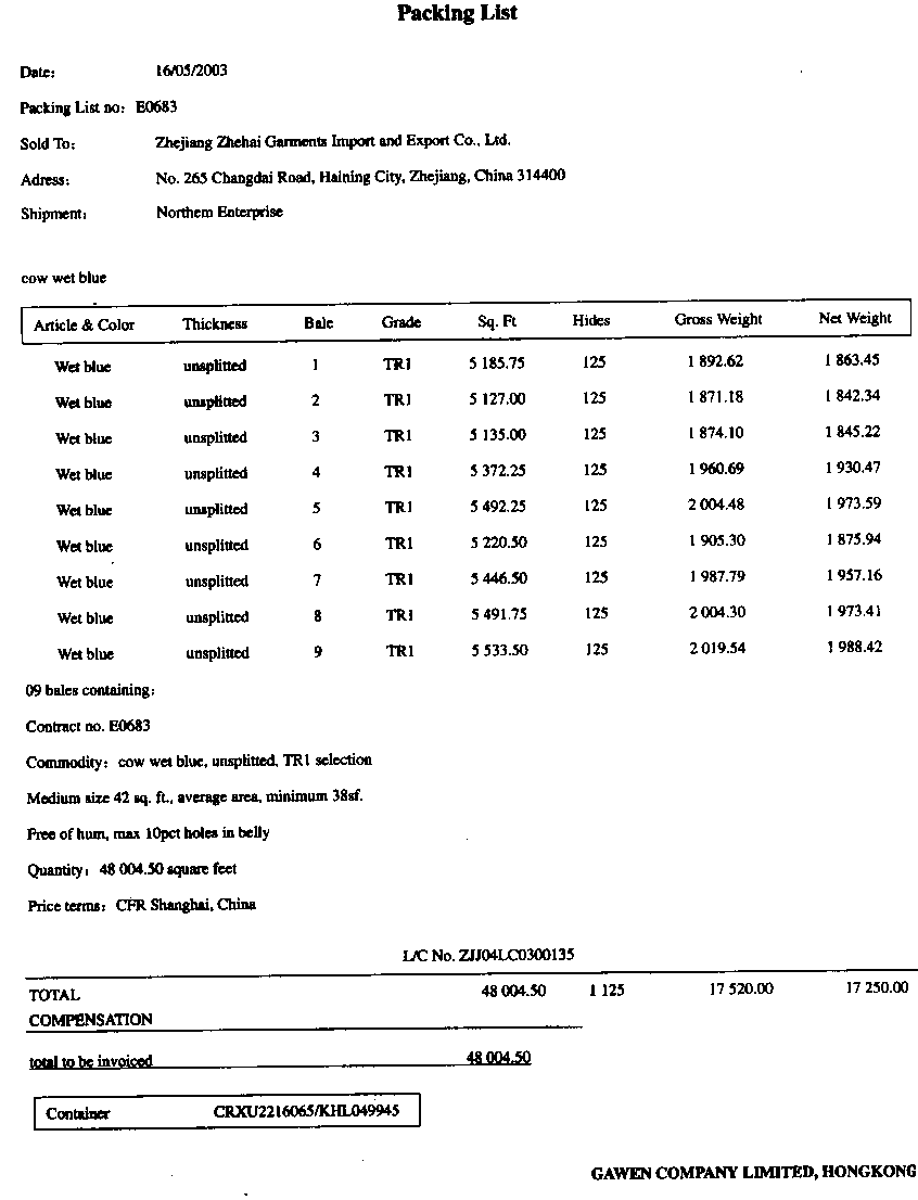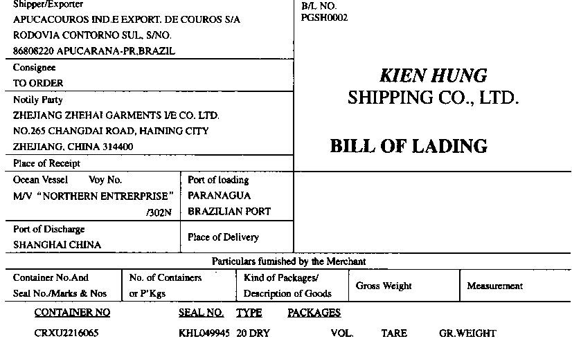 浙江浙海服装进出口/公司(3313910194)在对口合同项下进口蓝湿牛皮,委托浙江嘉宁皮革有限公司(3313920237)加工牛皮沙发革。承运船舶在帕腊纳瓜港装货启运,航经大阪,又泊停釜山港转"HANSA STAVANGER"号轮HV300W航次(提单号:HS03D8765)于2003年7月30日抵吴淞口岸申报进境。经营单位委托上海某货运代理公司持C29083100693号手册和310200103036124号入境货物通关单(代码:A)于次日向海关申报货物进口。该货物法定计量单位为千克,海运费、港杂费合计1 500美元,保险费为140美元。![]() ![]() ![]() ![]() 请根据以上资料,填制进口报关单以下栏目: |