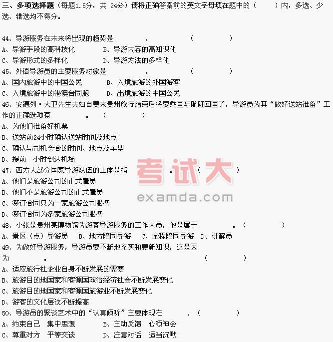 52、导游服务中在各项旅游服务中的纽带作用表现为 。( )