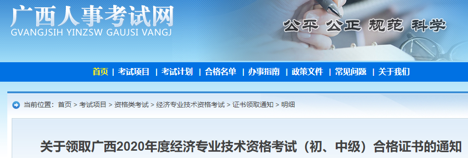关于领取广西2020年度经济专业技术资格考试(初、中级)合格证书的通知