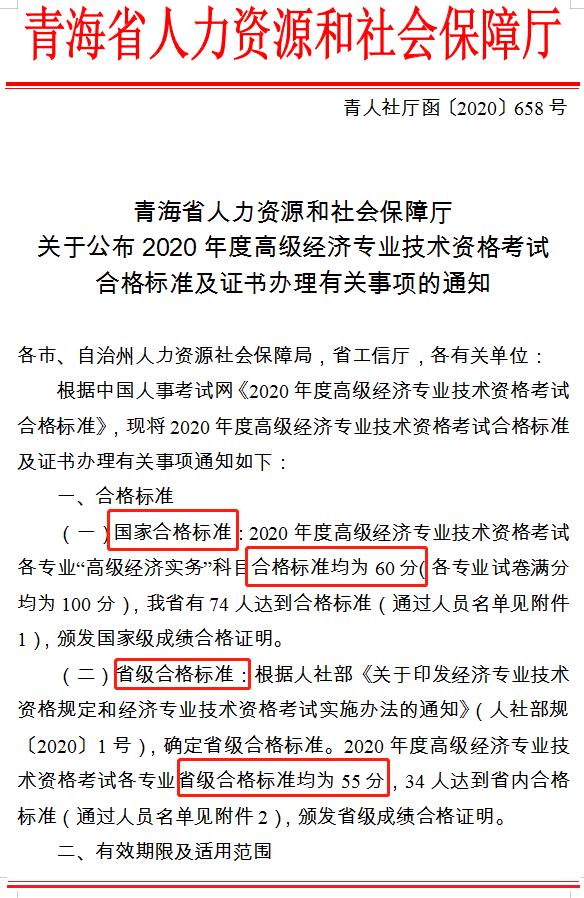 青海省人力资源和社会保障厅关于公布2020年度高级经济专业技术资格考试合格标准及证书办理有关事项的通知