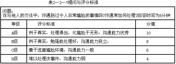 | 正确答案: (1)面试实施技巧: 1)充分准备。 2)灵活提问。 3)多听少说。 4)善于提取要点。 5)进行阶段性总结。 6)排除各种干扰。 7)不要带有个人偏见。 8)在倾听时注意思考。 9)注意肢体语言信息。 10)创造和谐的面试气氛。 (2)评分标准: 1)提出的问题是行为性的问题。(1分) 2)所设计的问题内容应针对沟通能力,与指标说明内容密切相关。(2分) 3)所设计的评分标准应针对沟通能力的指标内容,评分等级数量不少于3个。(2分) 4)各评分等级之间有明显的区别,易于评定。(2分) 5)每个评分等级要有相应的分值。(2分) 6)有回答问题的时间限定。(1分) 提问与评分标准见表2-2-7: ![]() |