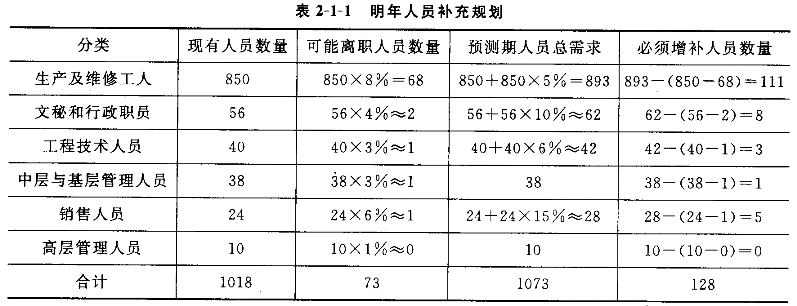 | 正确答案: (1)明年人员补充规划见表2-1-1。 ![]() (2)人力资源规划的制定流程。了解本企业的发展战略,收集本企业经营环境的相关信息。 1)盘点现有人力资源:核查人力资源的数量、质量、结构及分布状况。这一部分工作需要结合人力资源管理信息系统和职务分析的有关信息来进行。 2)人力资源需求预测:这一步工作与人力资源核查可同时进行,主要是根据企业的发展战略规划和本企业的内外部条件选择预测技术,然后对人力资源需求的结构和数量、质量进行预测。 人力资源需求预测的方法分两类:即直觉预测方法(定性预测)和数学方法预测(定量预测)。 3)人力资源供给预测:人力资源供给预测也称为人员拥有量预测,是人力资源预测的又一个关键环节,只有进行人员拥有量预测并把它与人员需求量相对比之后,才能制定各种具体的规划。人力资源供给预测包括两部分:一是内部拥有量预测,即根据现有人力资源及其未来变动情况,预测规划各时间点上的人员拥有量;另一部分是对外部人力资源供给量进行预测,确定在规划时间点上的各类人员的可供量。 4)起草计划匹配供需: ①确定人员需求量。这步主要是把预测到的各规划时间点上的供给与需求进行比较,确定人员在质量、数量、结构及分布上的不一致之处,从而得到纯人员需求量。 ②制定匹配政策以确保需求与供给的一致。这步实际是制定各种具体的规划和行动方案,保证需求与供给在规划各时间点上的匹配。主要包括:人员配置计划、人员需求计划、人员供给计划、人员培训计划、人力资源费用计划等具体行动方案。 5)执行规划和实施监控。 6)评估人力资源规划。 |
