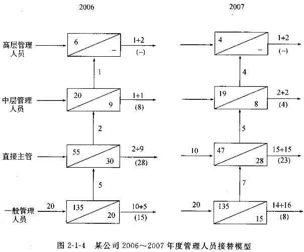3.请参考图2-1-4所示某公司2006-2007年度管理人员接替模型,对管理人员在2008年进行接替预测统计,并对其加以说明。(15分)![]() |