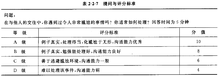 | 正确答案: (1)面试实施技巧: 1)充分准备。 2)灵活提问。 3)多听少说。 4)善于提取要点。 5)进行阶段性总结。 6)排除各种干扰。 7)不要带有个人偏见。 8)在倾听时注意思考。 9)注意肢体语言信息。 10)创造和谐的面试气氛。 (2)评分标准: 1)提出的问题是行为性的问题。 2)所设计的问题内容应针对沟通能力,与指标说明内容密切相关。 3)所设计的评分标准应针对沟通能力的指标内容.评分等级数量不少于3个。 4)各评分等级之间有明显的区别,易于评定。 5)每个评分等级要有相应的分值。 6)有回答问题的时间限定。提问与评分标准见表2-2-7: ![]() |