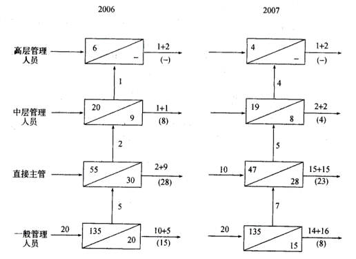16.如图1—4所示是某公司2006~2007年度管理人员接替模型,对管理人员在2008年进行接替预测统计。并加以说明。![]() |