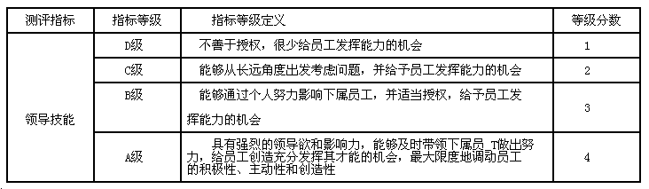 | 16.某公司在求新发展中准备对全公司领导干部的技术能力进行一次测评,公司总经理要求人力资源部设计一份领导干部技能指标分级评分标准表。请问如何设计较为合理? |